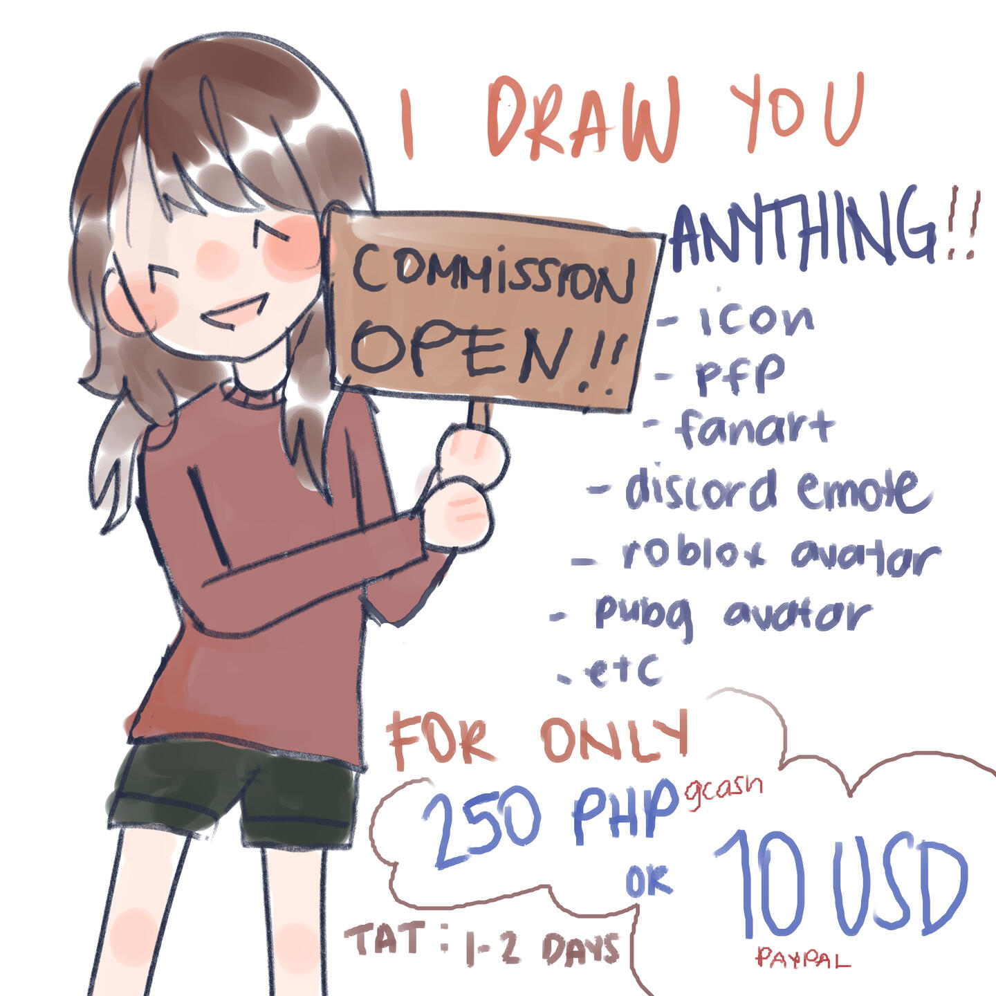 I can draw almost anything you'd want me to draw for the price of 250 PHP, or 10 USD. I accept anything, but not too overcomplicated art.I have the right to refuse a commission.